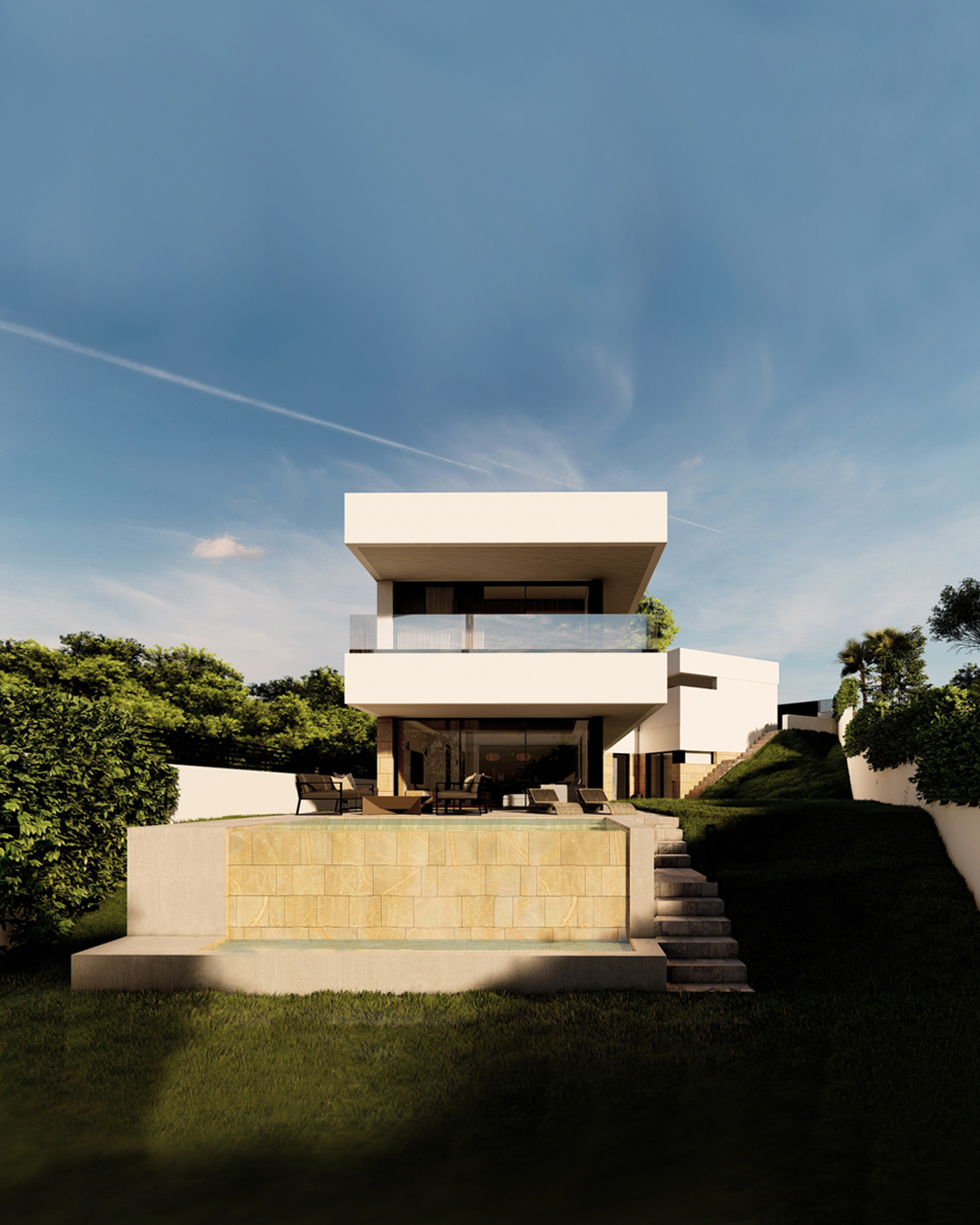 El proyecto se desarrolla sobre una parcela de geometría irregular, lo que ha permitido explorar una implantación singular que se adapta de forma natural al terreno y a sus límites. La vivienda, organizada en planta baja y planta primera, busca aprovechar al máximo las condiciones del solar, orientándose y abriéndose hacia el paisaje y el horizonte.